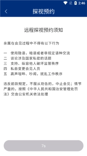 3、查看远程探视相关规定,禁止使用隐语、暗语,不得谈论涉及国家秘密的话题,不得私自更换会见人员,不得高声喧哗等。