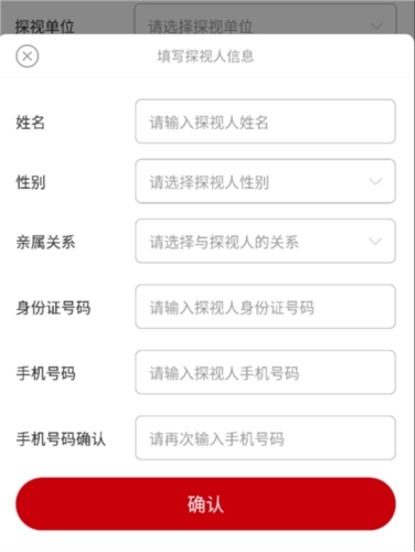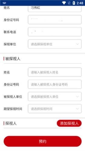 4、完成实名认证后进入系统,依次输入被探视人的姓名、身份证号、工作单位以及计划探视的时间。