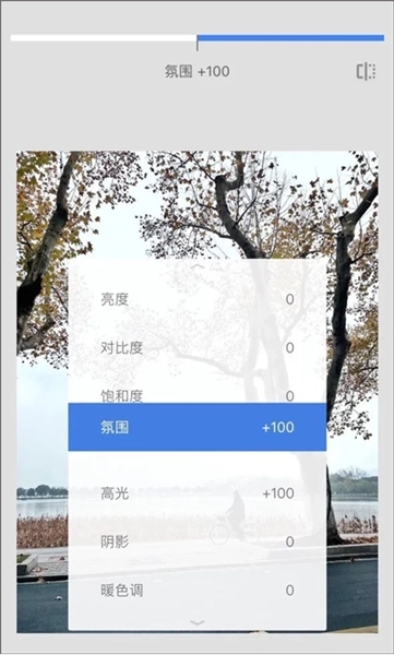 选择“调整图片”滤镜功能。把氛围与高光的参数各自提升到100,这样既能让图片整体变亮,又能保证阴影部分的细节不会缺失。
