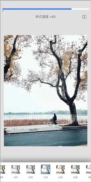 最后选择“粗粒胶片”滤镜。打开样式选项菜单并选定L03样式。可依据实际需求对样式强度进行适当调整,之后将粒度参数设置为0,以此保证图片呈现清晰效果。