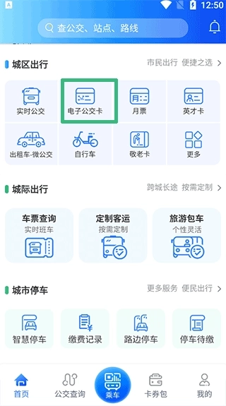 1、启动软件后,在首页的“城区出行”板块里找到“敬老卡”按钮并点击;