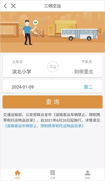 2、输入当前所在位置以及想要前往的目的地,点击查询按钮,即可完成班车票的购买操作。