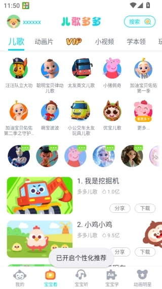 1、海量儿歌动画,既有经典之作也不乏原创内容,旋律轻松活泼,画面精致好看,能很好地抓住宝宝的注意力。