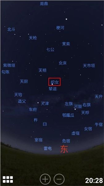3、继续拖动左侧页面,然后缩小天空范围,点击下方工具栏,使星星显示名字,找到织女星;