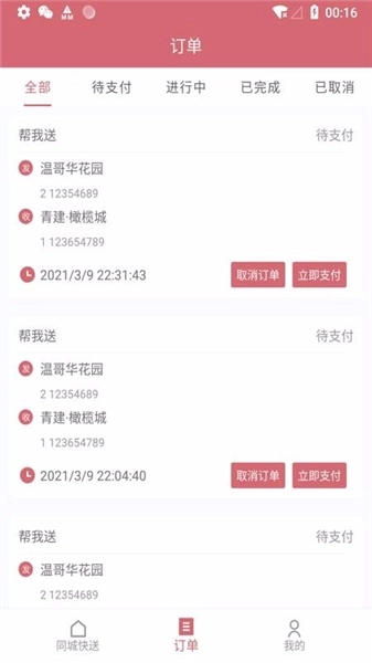 1、丰富的订单状态栏目,订单中心拥有待支付、进行中以及已完成多种状态栏目;