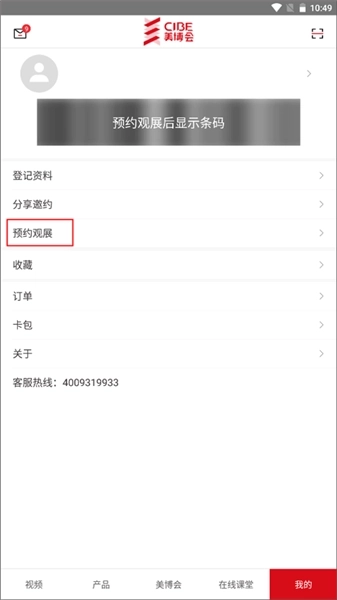 1、选择下方菜单栏【我的】界面,点击上方的“预约观展”。