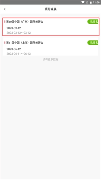 4、报名成功后右边就会自动显示“已报名”这几个字,【我的】主界面中也能看到你预约观展显示的条形码。