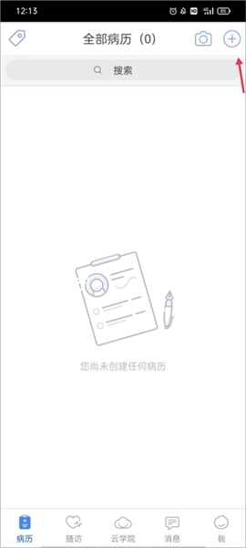 (1)输入手机号与验证码,登录软件账号后进入【病历】页面,点击右上角的“+”按钮。