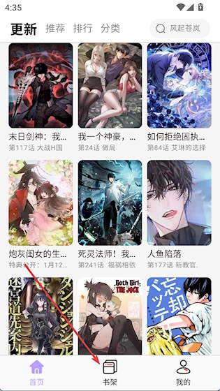4、多维度分类导航 首页设置了排行榜、更新区、题材分类等板块,方便用户快速发现新作品或跟进正在追更的内容,整体结构清晰明了,能有效提升查找效率。