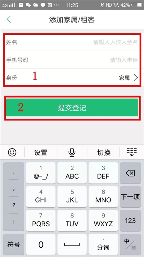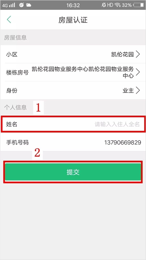2、选择房号、身份、姓名,点击“提交”。