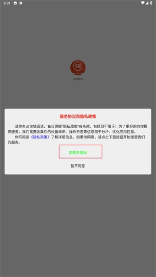 阅读【服务协议和隐私政策】后,点击【同意并接受】按钮,即可进入【辛超快修】应用的主流程。