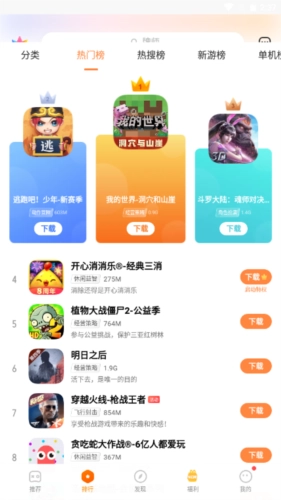 3、打开排行榜页面,这里设有热门榜、新游榜、单机榜、网游榜等多个不同类型的榜单,能让玩家更便捷地挑选适合自己的游戏。