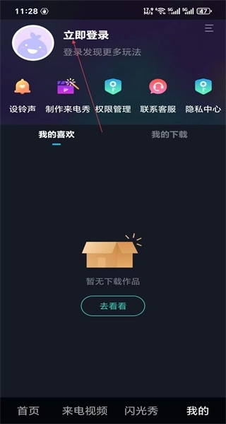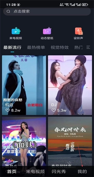 打开秀来电首页后,能看到来电视频等功能入口以及热门内容板块,接着点击“我的”选项,即可进入个人中心页面。