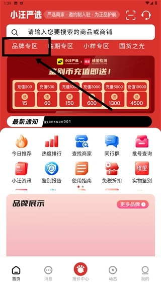 1、在【小汪严选】首页点击【品牌专区】,就能进入品牌分类界面,还可以通过搜索栏查找商品或商铺。