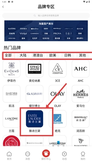 在【品牌专区】里,能借助分类标签来筛选品牌,点击【雅诗兰黛】这类品牌标识,就能进入相应品牌的商家列表页面。