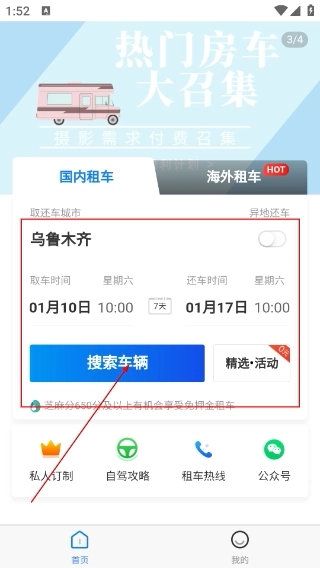 2、在【国内租车】页面选择取车城市与时间,设置好还车信息后,点击【搜索车辆】按钮,即可查找对应的房车资源。