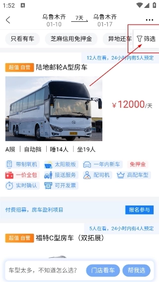 3、进入车辆列表页面后,点击【筛选】按钮,既可以通过设置条件来缩小搜索范围,也能够查看车辆的价格、配置等相关信息。