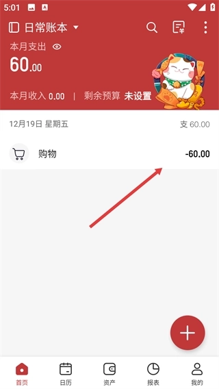 4、提交后返回首页,能看到本月支出已更新为60.00,并且会显示12月19日的购物支出记录,至此记账流程完成。