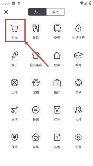 2、进入分类选择页面后,找到并选择位于支出分类首位的【购物】类别,就能进入该类别的金额填写界面了。