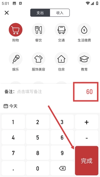 3、进入金额填写页面后,输入要支出的金额(例如60),核对好相关信息,接着点击【完成】按钮,就能提交这次的记账记录了。