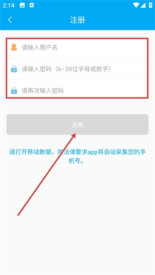 3、进入【注册】页面后,填写【用户名】,设置由6-20位字母与数字组合而成的【密码】并进行确认,开启移动数据后点击【注册】按钮。