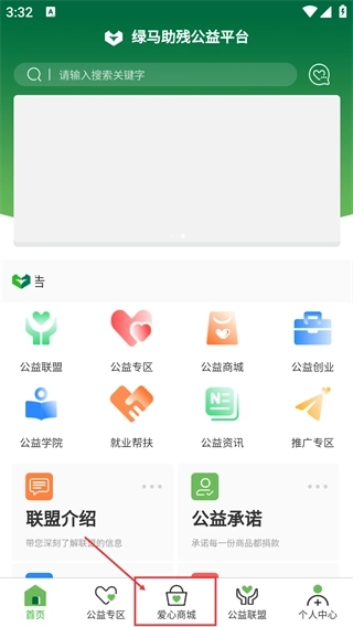 1、在【绿马助残公益平台】的首页,点击底部的【爱心商城】按钮,进入的页面包含【公益联盟】-【公益专区】等多个功能板块。