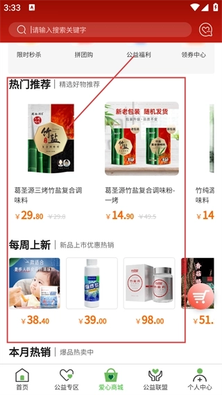 进入【爱心商城】后,能看到【限时秒杀】-【拼团购】等板块,此外还有【热门推荐】区域陈列着各类商品。