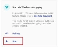 8、最后点击【start】按钮启动,若无法启动,可尝试重启设备或重启后开启无线调试功能。