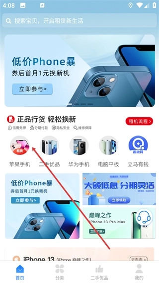 1、在应用首页点击【苹果手机】分类入口,进入全新手机分类选择页面,即可查看该品类的租赁商品。
