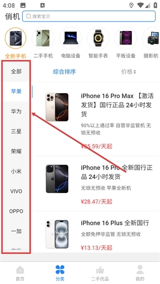 2、进入全新手机分类页面后,点击左侧的【苹果】选项,即可筛选出苹果品牌的租赁商品,这样能更精准地找到目标设备。