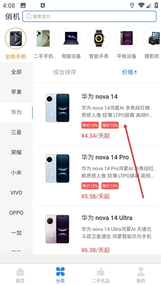 4、在按价格排序后的商品列表里,点击目标商品(例如【华为nova14】),就能进入该商品的详情页查看租赁相关信息。