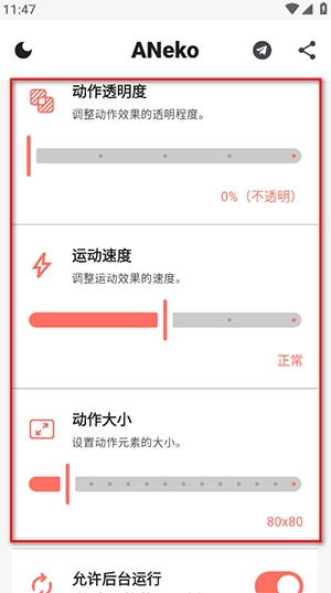 向下滑动页面,按照自己的偏好调整动作的透明度、运动速度以及动作大小。