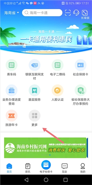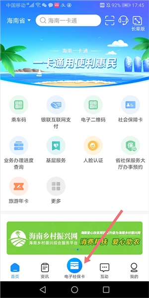 打开并登录海南人社(也就是海南一卡通),进入首页后点击【人脸识别】,依据上文的简介完成认证流程。等认证通过了,再回到首页,点击底部的【电子社保卡】(就是下图红色箭头指向的位置)