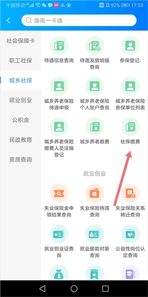 在打开的新页面中上拉页面至【社保缴费】处点击