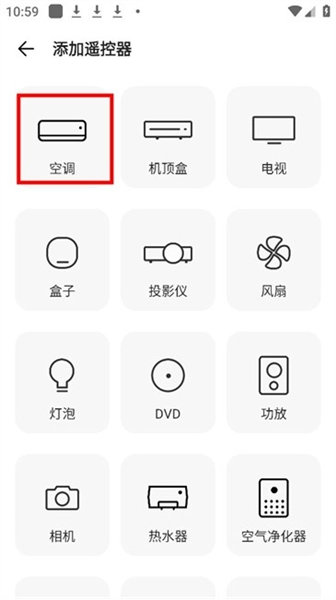 若选择“手动添加遥控”选项,进入对应界面后,需挑选待配对智能遥控器的目标设备,此处我们以空调这一设备类型来举例说明操作流程。