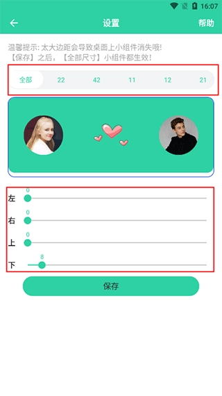 上方可选择需调整边距的组件尺寸,拖动下方的调整条操作即可,设置完成后保存就行。
