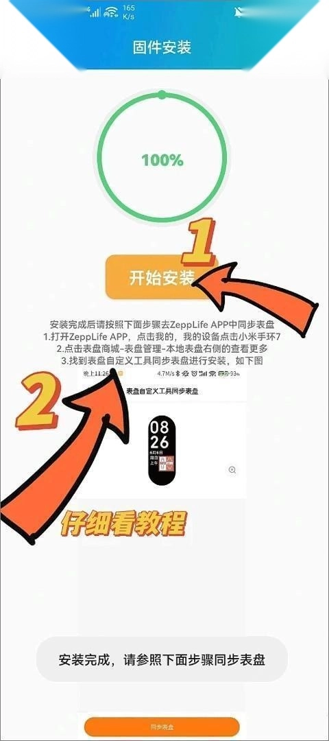 接下来点击“开始安装”按钮,安装完成后,在Zepp Life应用里完成表盘同步就可以了。