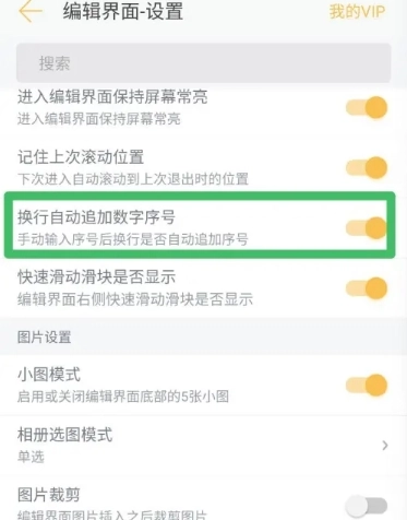 当弹出相关窗口后,找到“换行自动追加数字序号”这一选项,将其右侧的开关开启就完成了操作。