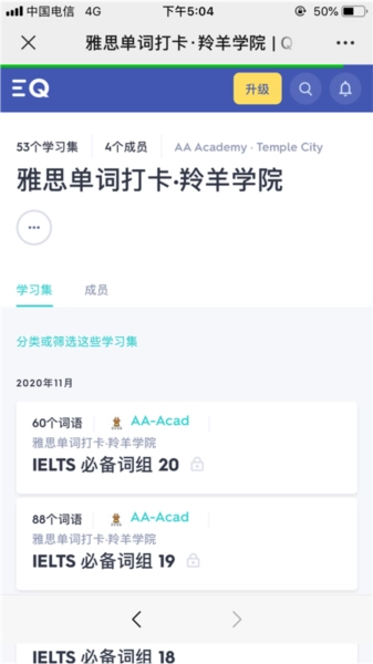 2、点击并进入"班级"后,便可看到班级中所包含的所有"学习集"(也就是单词卡)。