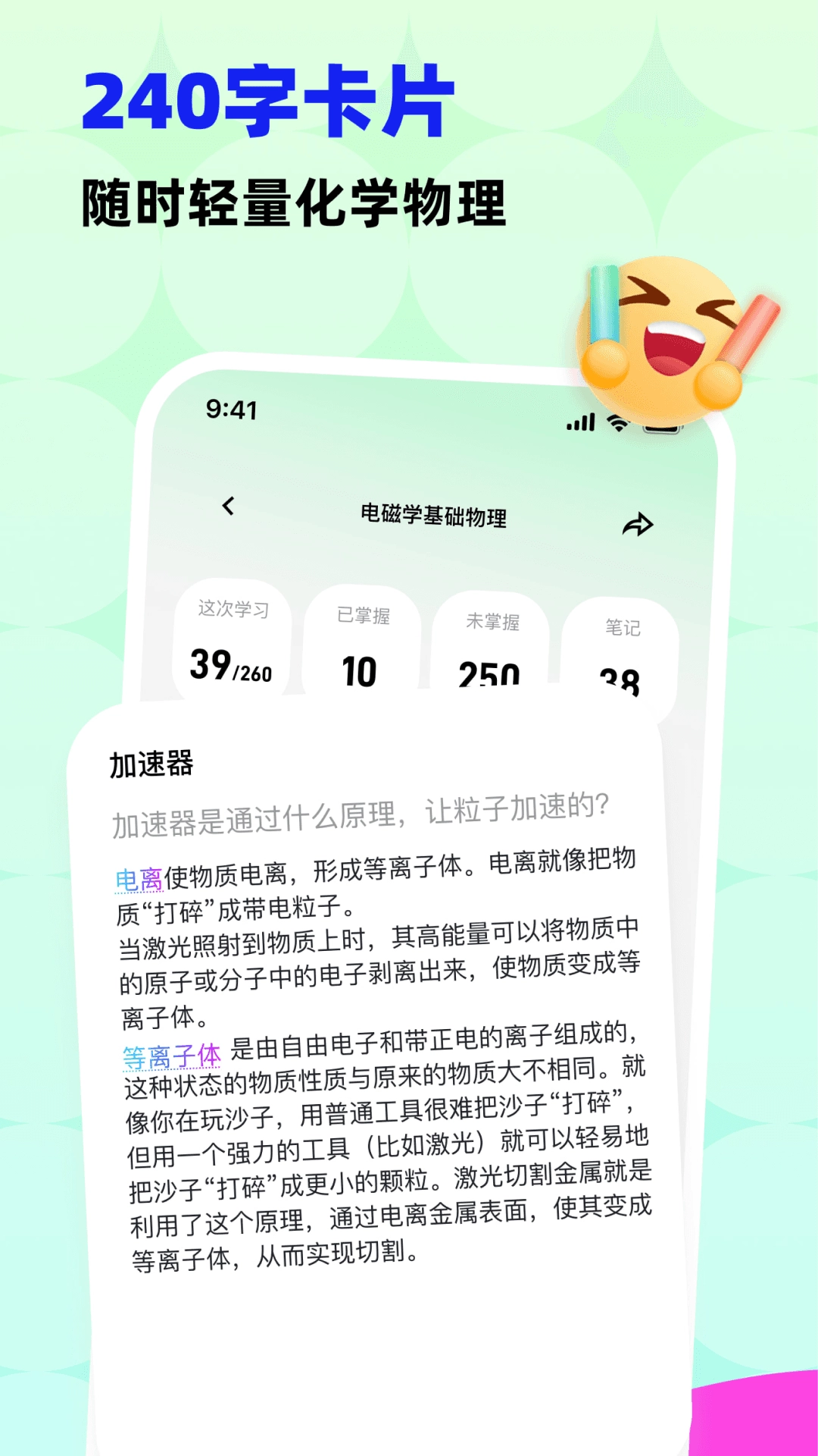 在主页找到“知识卡片”入口,通过滑动屏幕可以查看经过提炼、字数控制在240字以内的物理概念内容,还能一键完成收藏操作。