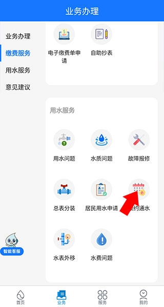 之后点击导航栏里的【业务】-【预约通水】就能申请通水了