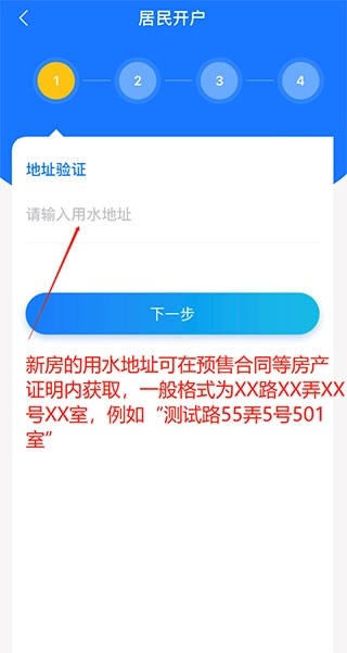 阅读办理须知后,点击确认按钮进入地址验证界面。用户填写用水地址时,可参照房产证明上的地址,完成填写后点击下一步,就能进入信息填写页面。