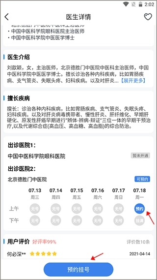 这里面会包含医生的相关信息介绍,你可以挑选想要预约的具体时间和日期,然后点击“预约挂号”按钮就可以了。