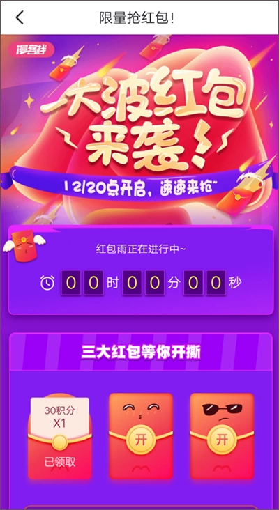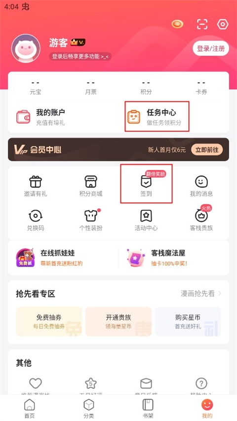 每周一中午12点和晚上20点,大家可以在首页参与抢红包活动,有机会领取积分、阅读券、铂金VIP等各类奖励。