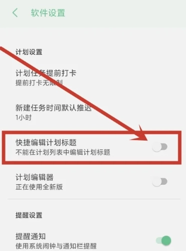 找到“快捷编辑计划标题”旁边的圆形图标,点击它就能启用该功能。