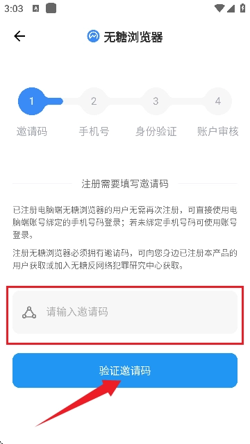 新用户需先注册账号才能登录使用。点击“注册账号”按钮(如图所示),进入邀请码与密码的填写界面,接着输入邀请码并点击“验证邀请码”按钮即可。