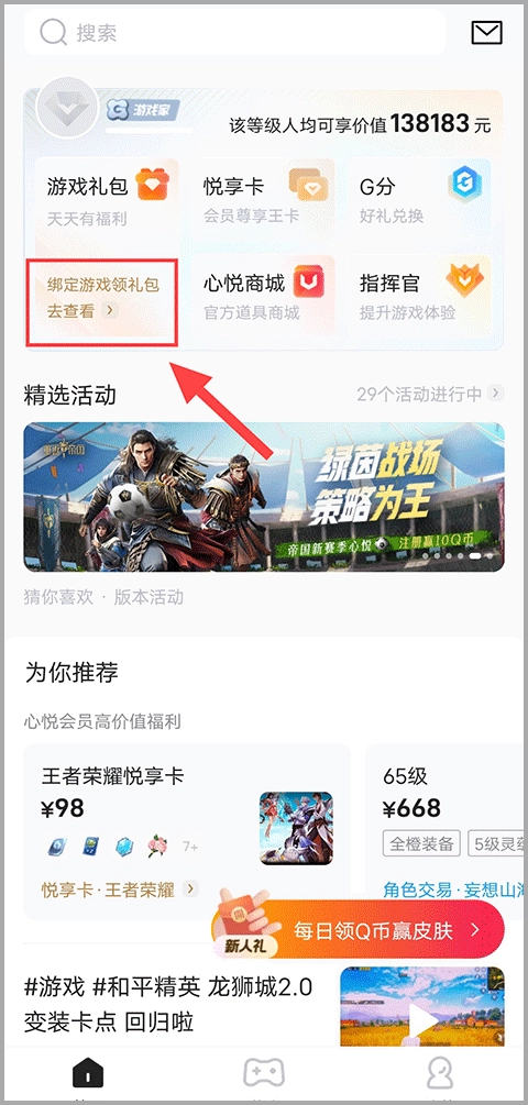 首先启动心悦俱乐部应用,进入主界面后,在顶部区域找到会员相关板块,点击其中的“绑定游戏领取礼包”选项。