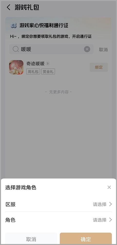 点击绑定按钮后,系统会弹出“选择游戏角色”的窗口,你只需在窗口中选定对应的区服与角色,再点击确定按钮,就能完成绑定操作了。
