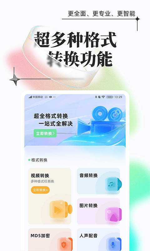 支持视频格式转换、音频格式转换、图片格式转换、MD5加密、彩铃制作以及文件转换。