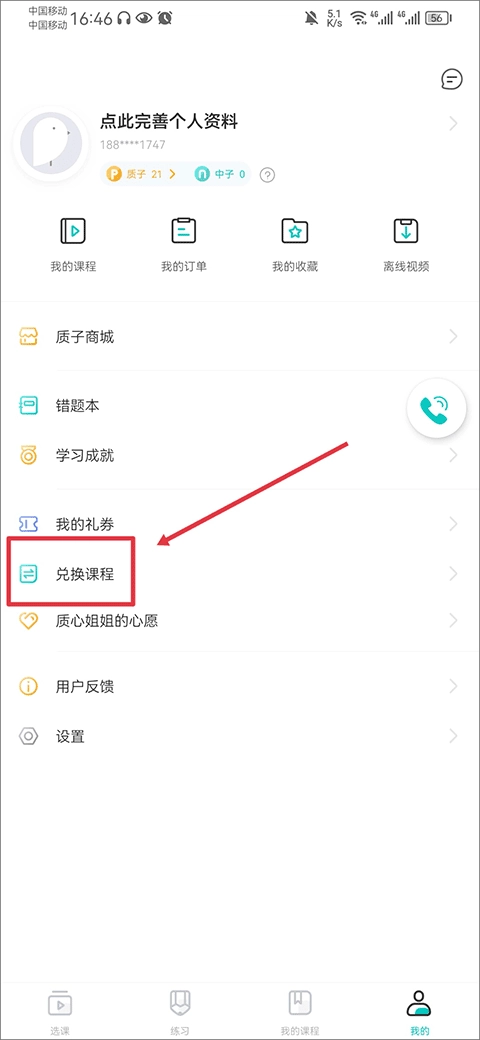 在“个人”页面,点击兑换码课程,进入兑换页面